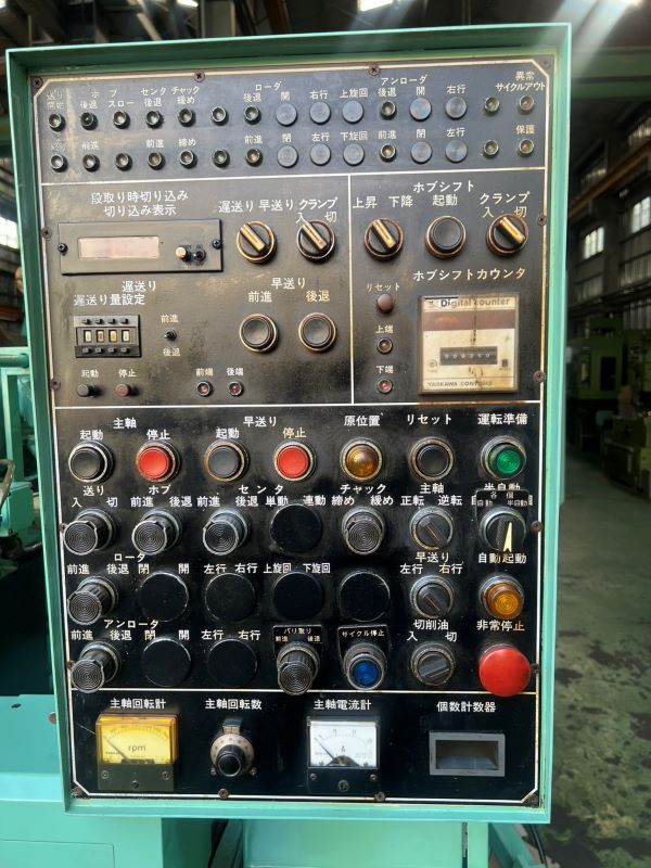 切削最大外徑7~100、工件允許長350mm、工作實際切削長180、切削最大模數2.5、切削齒數5~100、滾刀回轉數200~1500rpm、滾刀最大徑×長:φ65×65、旋回向度左、右45°、滾刀移動量30、主馬達5HP×4P、機械重量2100KG